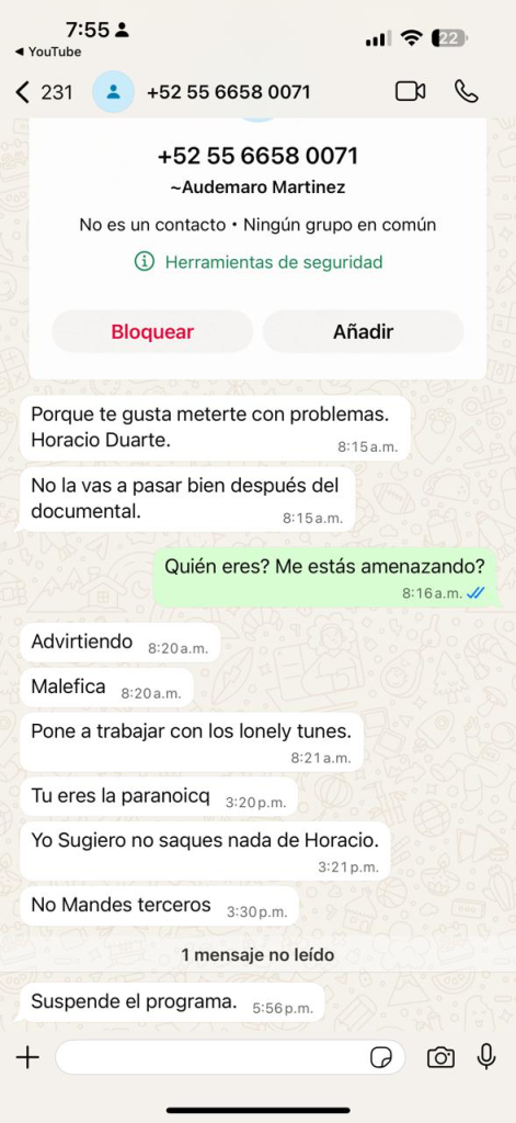 Ante la promoción y publicación del material, la periodista recibió un mensaje de texto en Whatsapp de una cuenta cuyo nombre se lee “Audemaro Martinez”. El mensaje de amenaza indica lo siguiente: “Por qué te gusta meterte con problemas. Horacio Duarte.” “No la vas a pasar bien después del documental”. A lo que la periodista preguntó: “¿Quién eres? ¿Me estás amenazando?, y la respuesta fue “Advirtiendo” “Yo sugiero no saques nada de Horacio”, además de “Suspende el programa”.