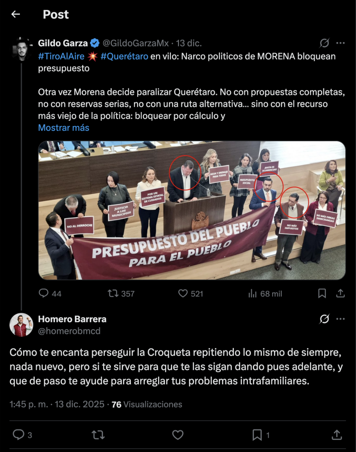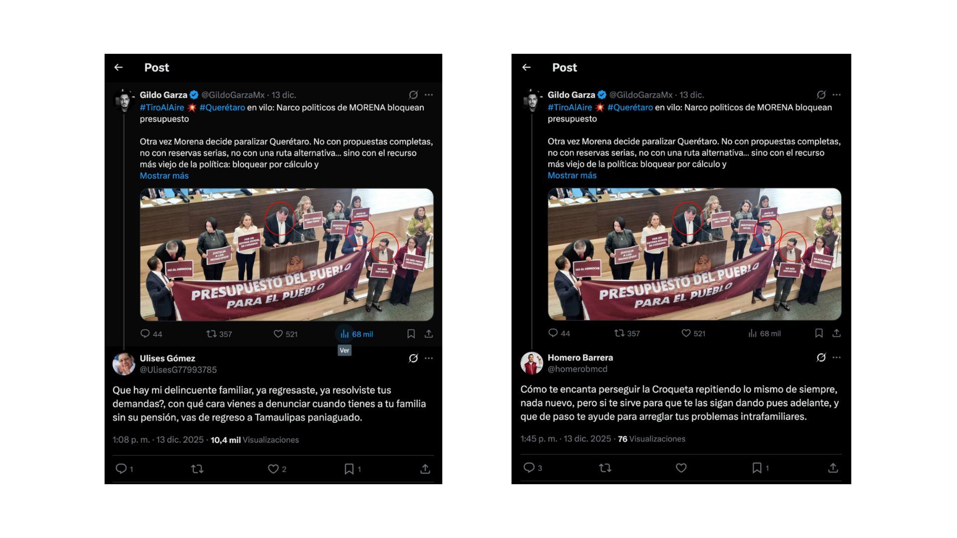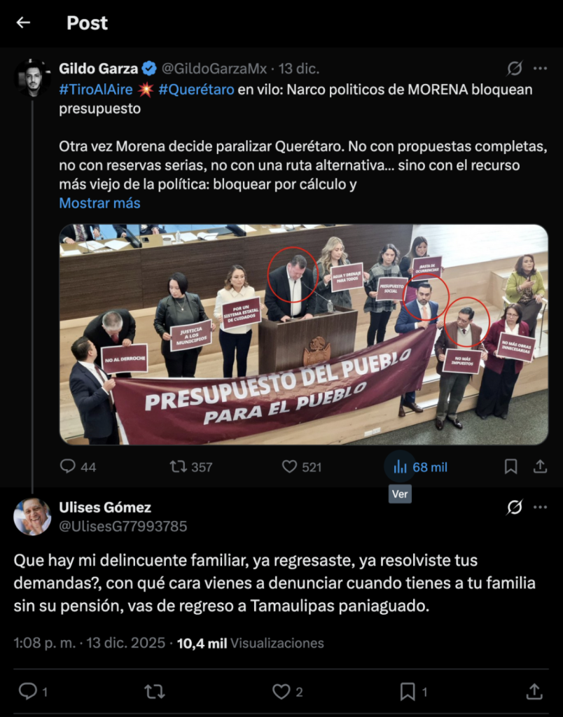 Ciudad de México, a 23 de diciembre de 2025.- El periodista Gildo Garza fue objeto de discurso estigmatizante y criminalizante, luego de publicar una nota de editorial en la red social de X, esto de parte de los diputados Ulises Gómez y Homero Barrera de la bancada de Morena. En la nota Garza hace referencia al actuar de los funcionarios públicos en una sesión del congreso local de Querétaro.