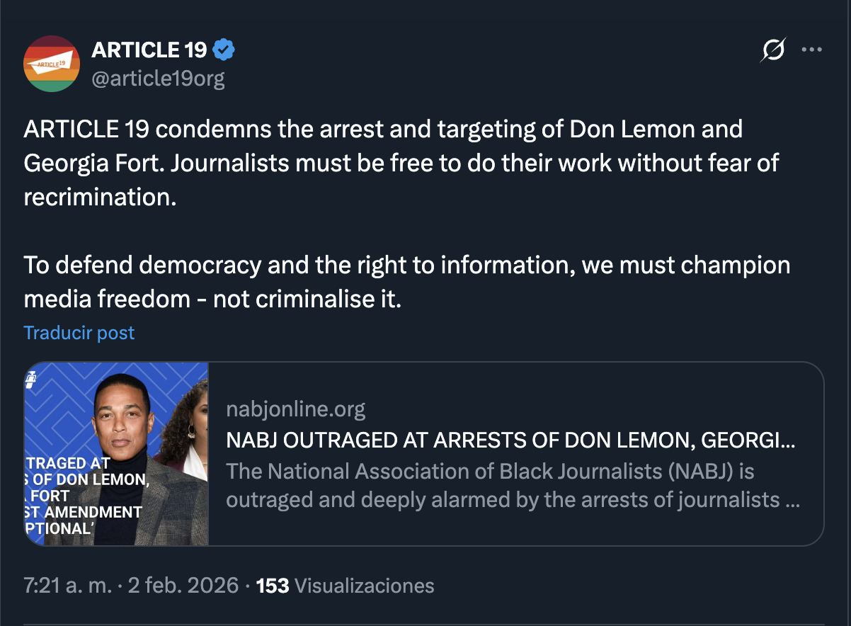 Ciudad de México a 2 de febrero 2026.- ARTICLE 19, desde su oficina Internacional, condena la detención y el hostigamiento contra Don Lemon y Georgia Fort. Las y los periodistas deben poder realizar su trabajo sin temor a represalias.