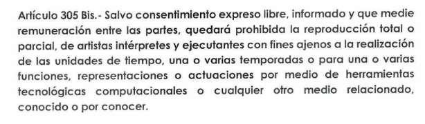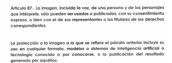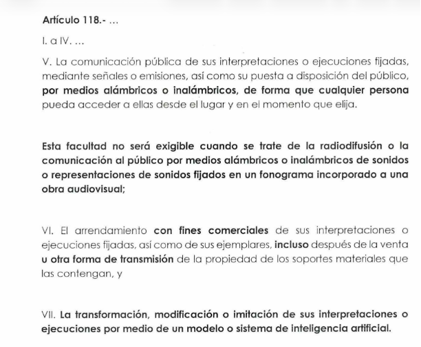- La iniciativa también propone, a partir de la modificación del artículo 118 de la Ley Federal del Derecho de Autor, ampliar los derechos de artistas intérpretes o ejecutantes para autorizar o prohibir el uso de sus interpretaciones mediante la IA, incluyendo la transformación, modificación o imitación de sus interpretaciones.